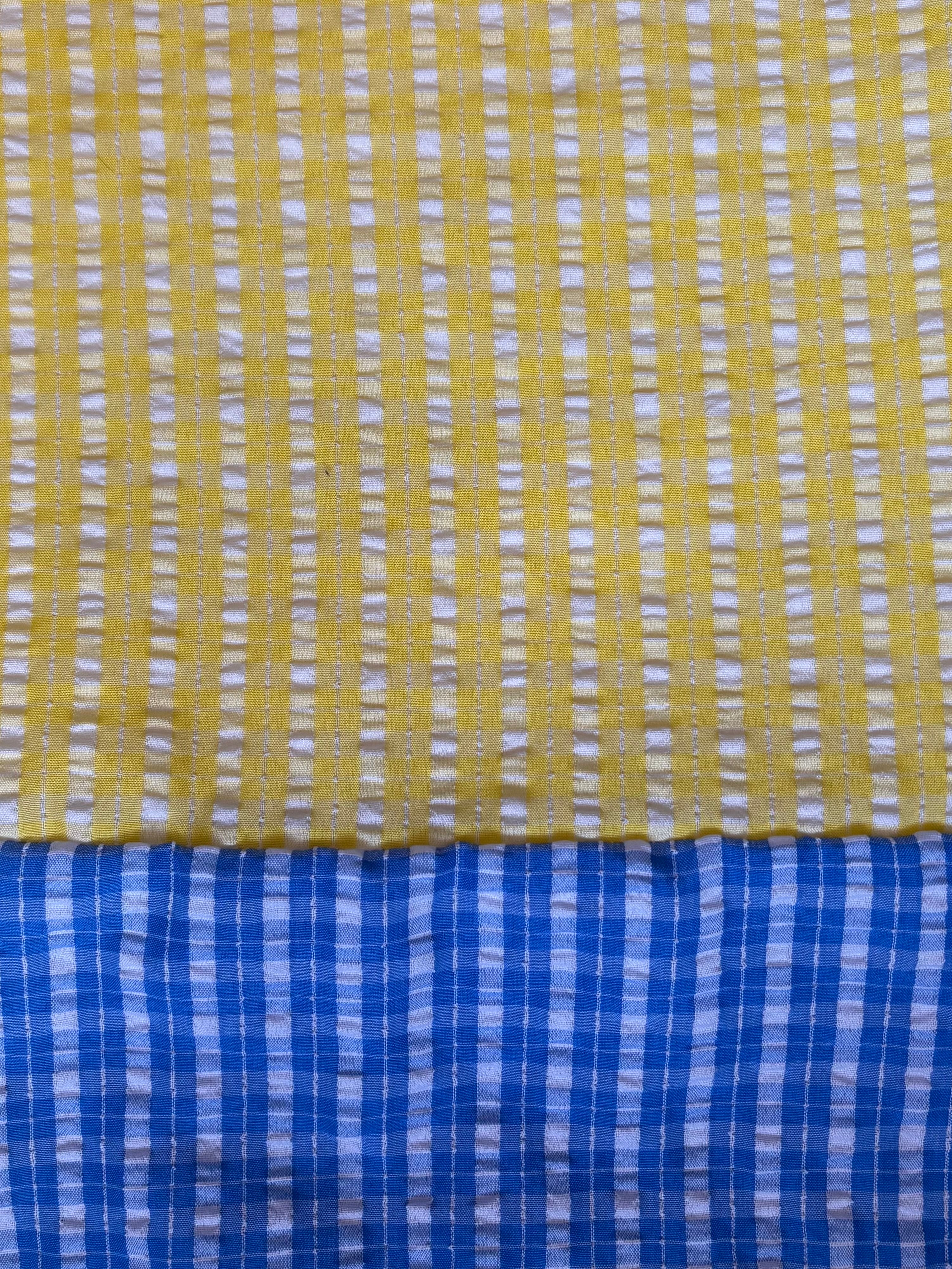 Seersucker light weight cotton, CAPRI length. Elastic and drawstring waist. These are 2 tone, with a coordinating 6”–8” border. Super comfy and wash well. Packaged in their own matching bag.