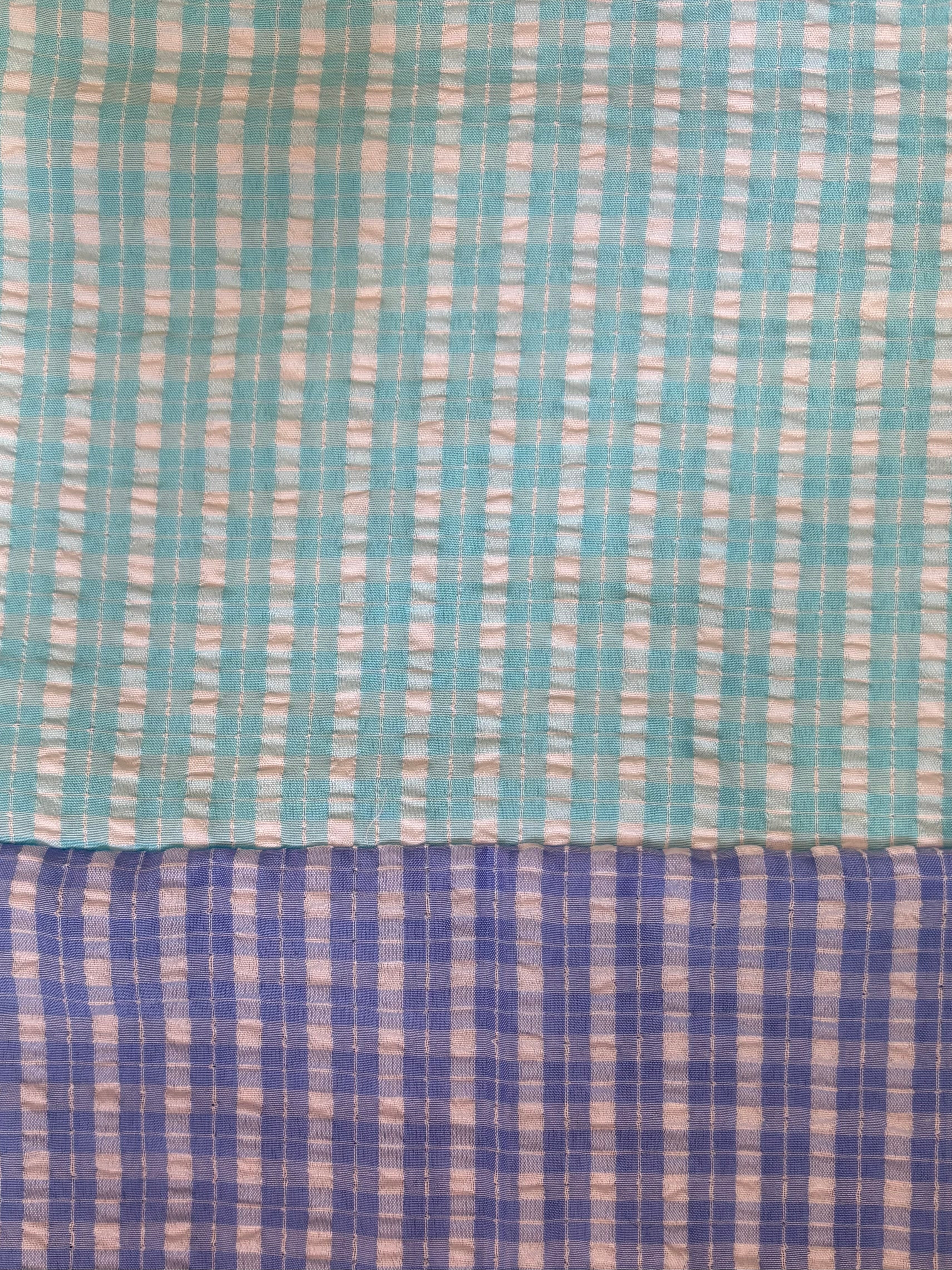 Seersucker light weight cotton, CAPRI length. Elastic and drawstring waist. These are 2 tone, with a coordinating 6”–8” border. Super comfy and wash well. Packaged in their own matching bag.