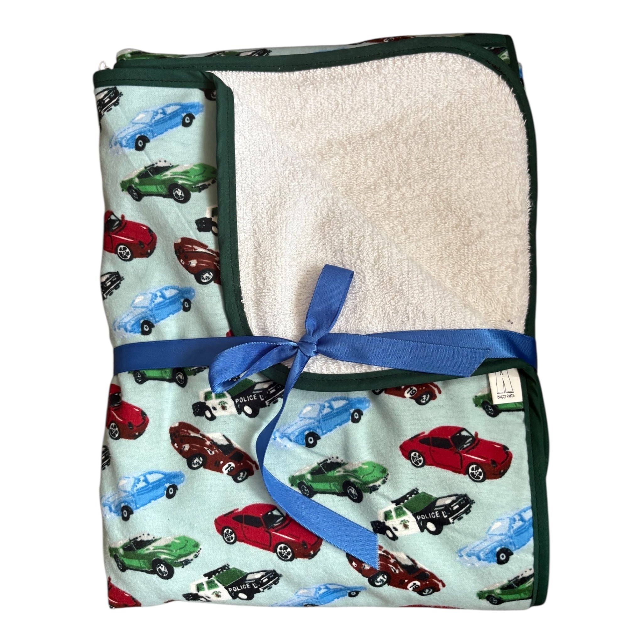 40"x 40” Huge hooded towel, cozy flannel & plush terry. Big enough to last an entire childhood. Hood sewn in the corner.
