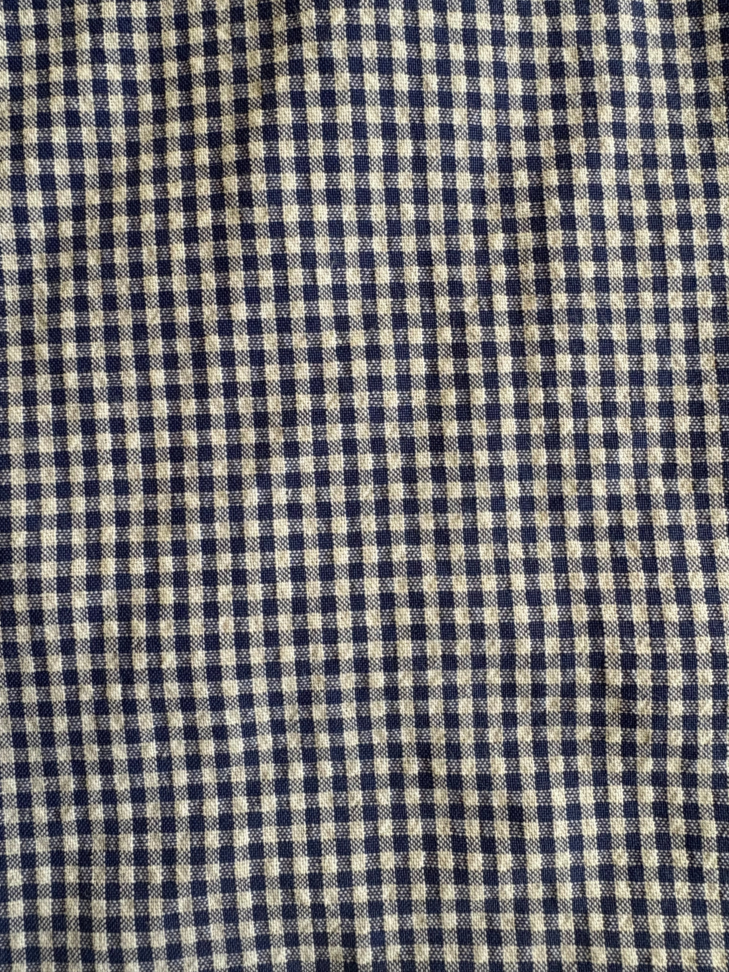 Navy blue gingham meets laid-back comfort in these playful pants that *look* like classic seersucker but pack a little extra substance. Crafted from a cotton-poly blend with that signature textured weave, they're structured enough to hold their shape while staying comfy.. Perfect for those days when you want that crisp, preppy vibe without sacrificing all-day wearability.